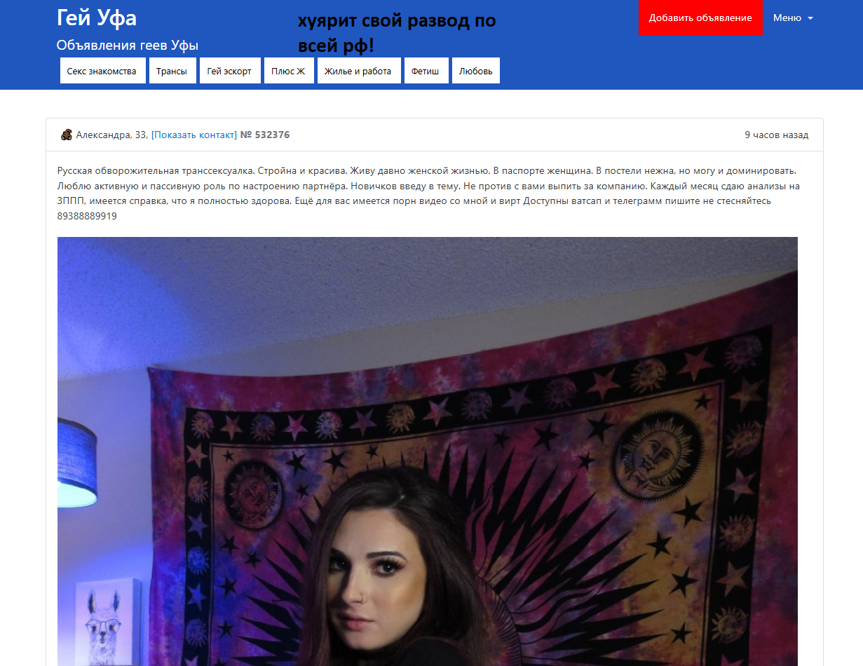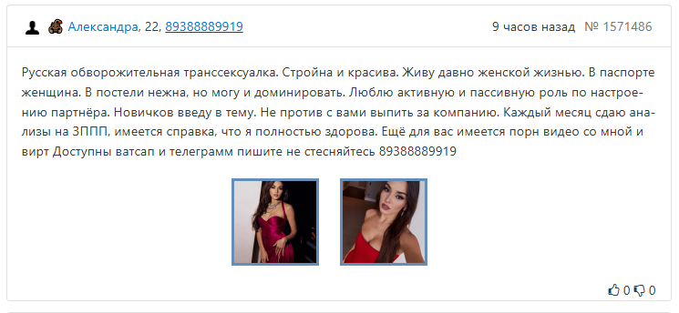 Русская обворожительная транссексуалка. Стройна и красива. Живу давно женской жизнью. В паспорте женщина. В постели нежна, но могу и доминировать. Люблю активную и пассивную роль по настроению партнёра. Новичков введу в тему. Не против с вами выпить за компанию. Каждый месяц сдаю анализы на ЗППП, имеется справка, что я полностью здорова. Ещё для вас имеется порн видео со мной и вирт Доступны ватсап и телеграмм пишите не стесняйтесь 89388889919