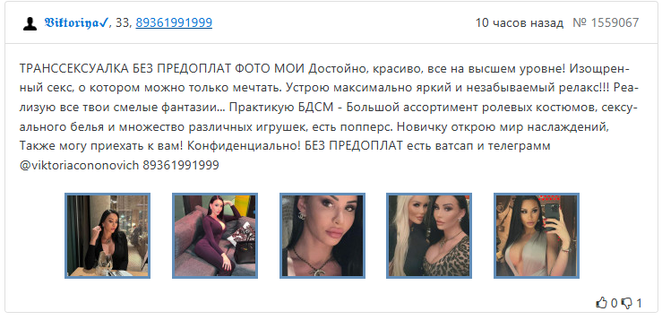 ТРАНССЕКСУАЛКА БЕЗ ПРЕДОПЛАТ ФОТО МОИ Достойно, красиво, все на высшем уровне! Изощренный секс, о котором можно только мечтать. Устрою максимально яркий и незабываемый релакс!!! Реализую все твои смелые фантазии... Новичку открою мир наслаждений, Также могу приехать к вам! Конфиденциально! БЕЗ ПРЕДОПЛАТ есть ватсап и телеграмм @viktoriacononovich 89361991999